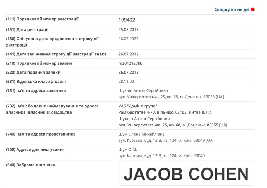 Дані про незаконне володіння Шухніним ТМ Jacob Cohen
